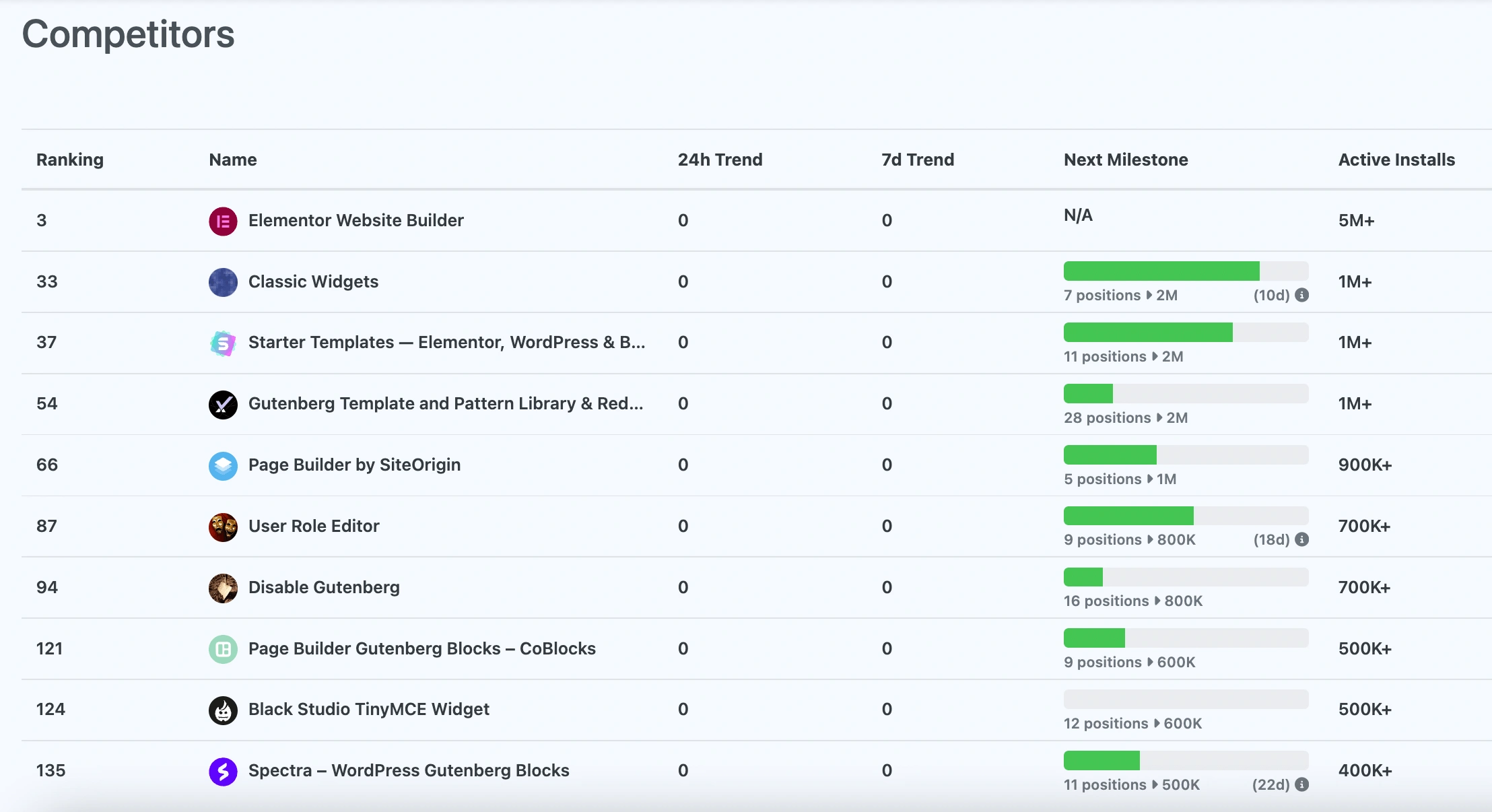最后一部分显示了插件竞争对手的列表以及他们的排名和增长趋势的摘要。
