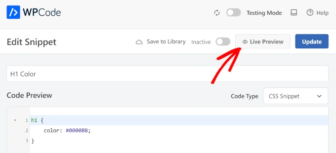 实时预览在 WPCode 编辑器内的网站预览中显示更改,因此您无需保存、切换标签页和刷新即可检查您的工作。