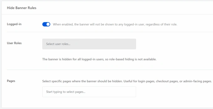 通过此更新,您可以根据登录状态、用户角色或特定页面来决定谁能看到横幅。例如,您可以在管理员和其他已登录用户使用仪表板时隐藏弹窗。