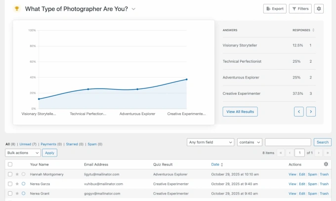 测验结果直接流入WPForms的条目管理系统,您可以查看详细回复、分析绩效,并导出结果用于报告或协作。