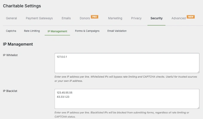 Charitable Lite 现已内置 CAPTCHA 支持,而 Charitable Pro 则添加了高级控制功能,如 IP 管理和速率限制,为捐赠表单、注册和其他提交流程提供分层保护。