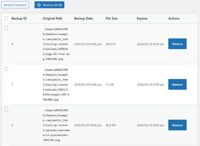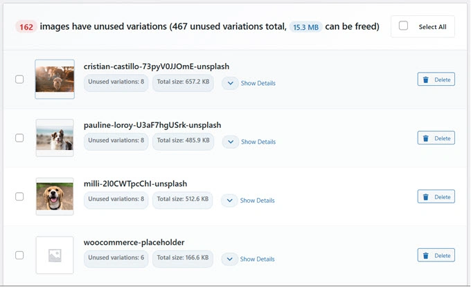 这很有用,因为 WordPress 每次上传都会创建多个图片尺寸(缩略图、中等、大图等)。随着时间的推移,这些额外的文件会堆积起来悄无声息地占用您的存储空间。